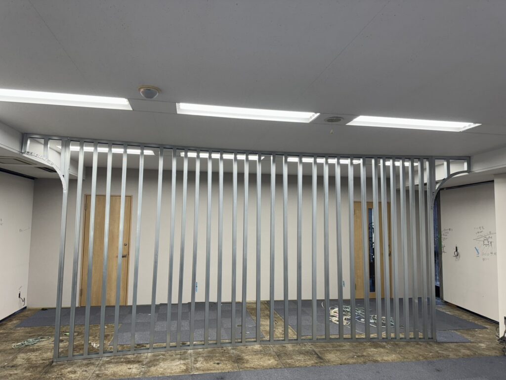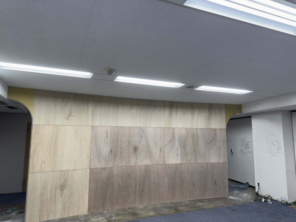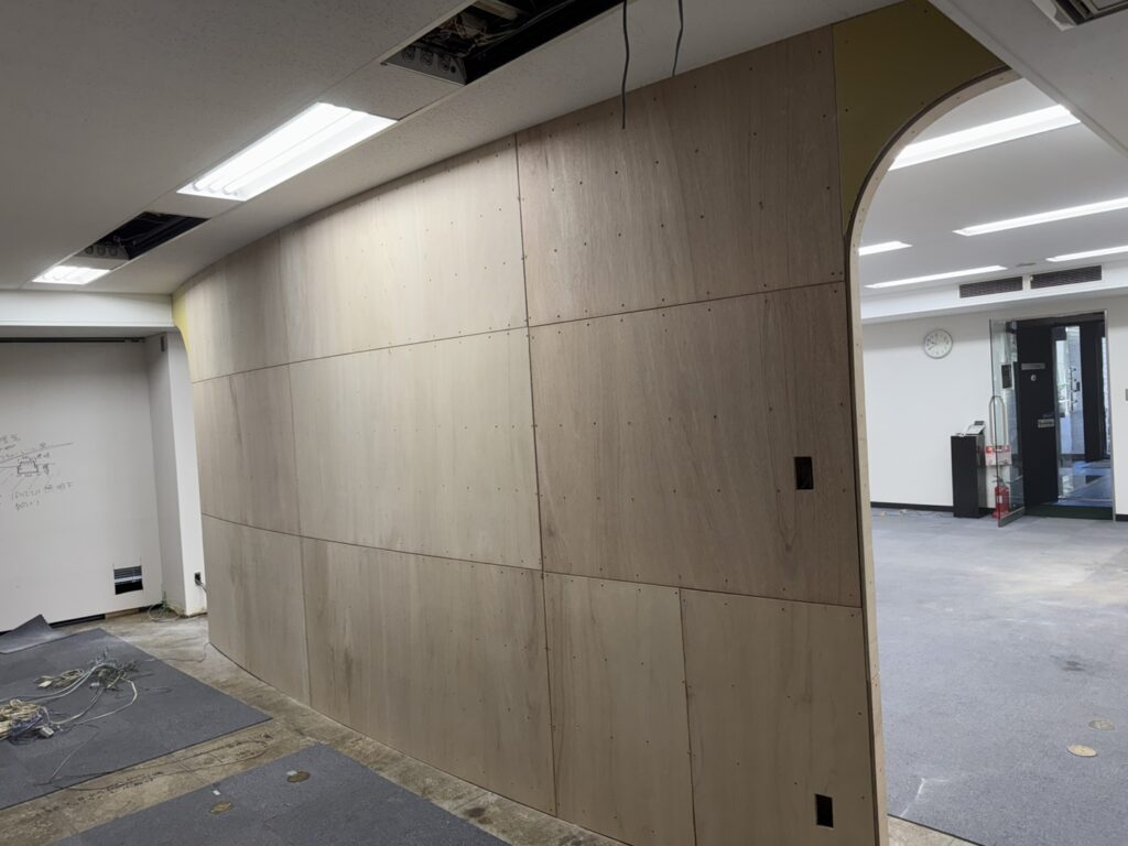 文京区目白台の事務所ビルにて、R壁とアーチ開口のLGS組み、曲げベニヤ貼り工事を行いました。特注ランナーを使用した高度な曲線施工で、デザイン性の高い空間を実現した事例をご紹介します。