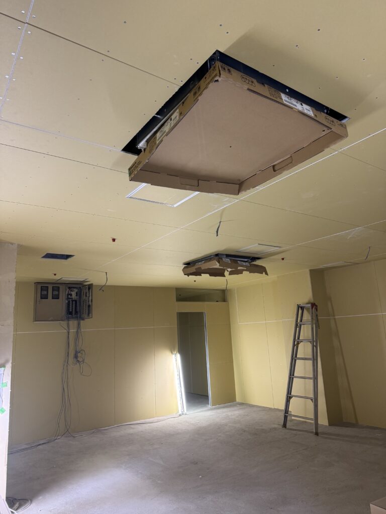 石膏ボード12.5mm 壁や天井の下地材として使用しました。12.5mmは一般的な内装で最もよく使用される厚さで、防火性能に優れています。この上にクロスや塗装などの仕上げ材を施工します。
