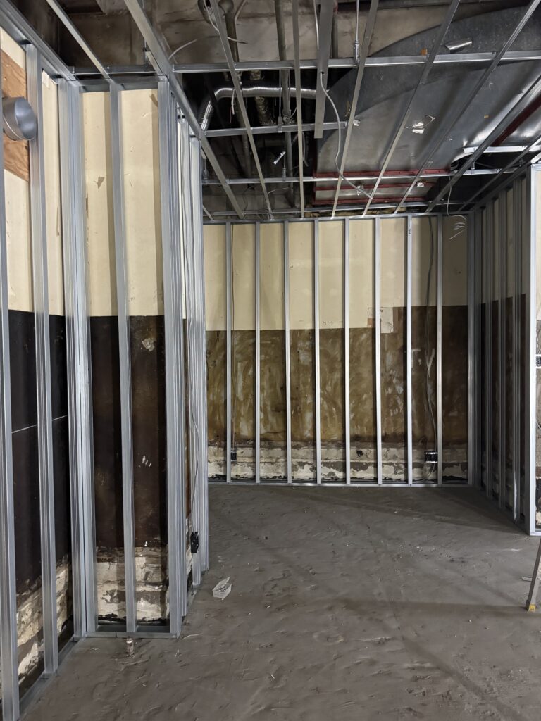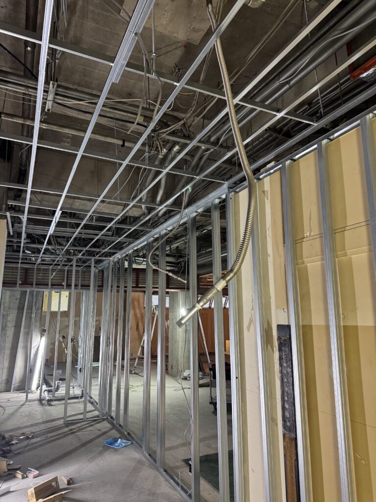 その後、LGSで骨組みを組み上げ、天井、壁の順に軽天材を配置。水平・垂直を確認しながら確実に固定していきました。